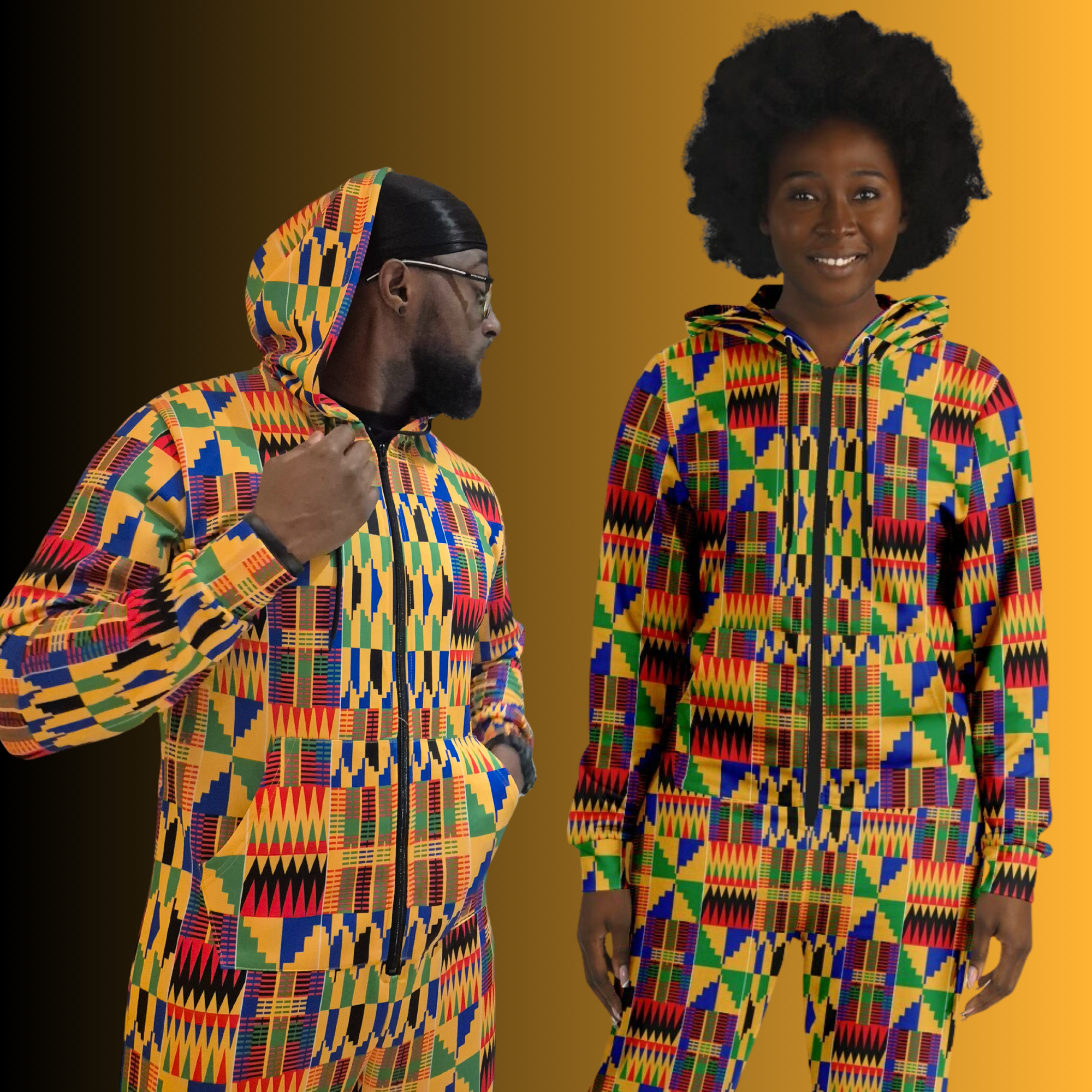 Celebrate vibrant culture with our Kente patterned jumpsuit, where tradition meets comfort. Perfect for lounging at home or stepping out in style. Bold, comfortable, and uniquely you, this jumpsuit blends traditional African elegance with modern versatility.