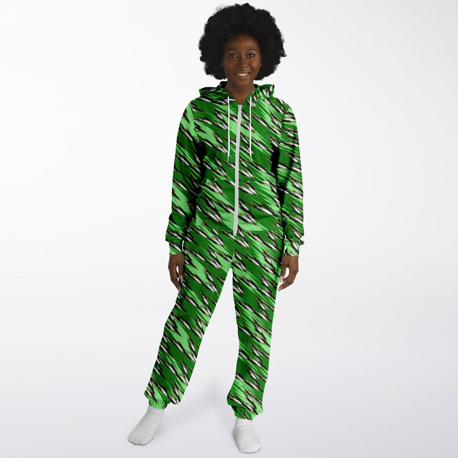 Stay warm and stylish at home with this unique piece! The front zip and drawstring cords make it easy to wear, while the soft fabric ensures all-day comfort. Perfect wear for lounging or quick errands.